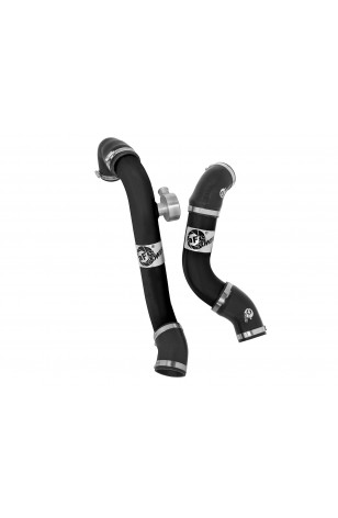 aFe Power's intercooler tubes are constructed from 2-1/2" (Hot Side) and 3" (Cold Side) mandrel-bent aluminum tubing for maximum flow then, powder-coated for a nice finish. The high-temp wrinkle-black powder-coating also insulates the tubes from engine heat and protects the tube from corrosion. The smooth transition bends decrease turbulence, minimize pressure loss, while increasing horsepower and torque. Also included is one 1/8" NPT port on each tube which is provided for a sensor or water-methanol injection.