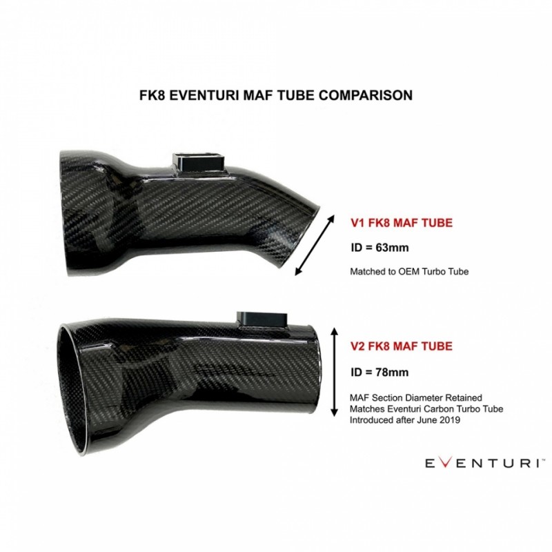The V2 MAF tube does not reduce in diameter after the MAF sensor. As a result, the larger diameter of the V2 MAF tube (78mm) matches the diameter of the new carbon charge pipe to conjoin properly.