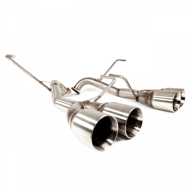The main functional elements of this catback exhaust are its matched flow dynamic from the 3" diameter resonated main circuit into the 2" diameter secondary circuits (the dual circuits of the rear of the exhaust). Starting from a goal of matching the flow of exhaust through the 3" section and into the 2" sections, the division of exhaust is accomplished with a larger diameter 2.25" Y section in the midpipe, which takes the position of highest friction in the catback exhaust and ensures a proper division of exhaust gas flow without inducing restriction. Many other companies go oversized on the rear circuits to accomplish this goal of keeping flow up in a divided exhaust, however, the overall midrange torque suffers and the horsepower is no higher than a system with a smaller terminal circuit diameter. Our system on the other hand, produces more torque through the midrange than most exhausts on the market, while retaining higher than average horsepower gains. The result is a catback exhaust that makes a substantial difference in the behavior of the vehicle.