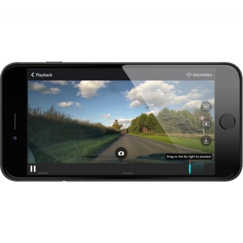 With the Road Angel Halo app for iOS and Android you can connect to the dash cam via WiFi. Your smartphone then acts as a monitor, offering a live stream and letting you review, edit, and download footage.
