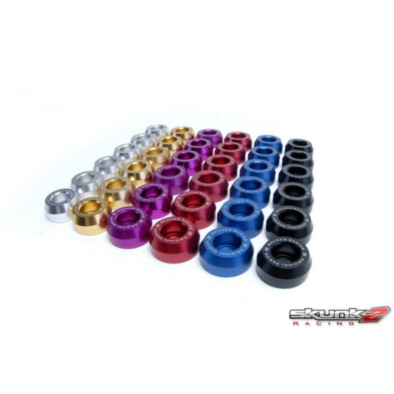 The first of their kind and only available from Skunk2, Lower Control Arm Dress-Up Washers for most 88-00 Civics and 90-01 Integras are available in black, blue, gold, purple, red, and clear hard-anodized finishes. Lower Control Arm Dress-Up Washers substitute the factory lower control arm hardware with tapered, OEM-grade socket-head bolts flush-mounted inside of our unique aluminum washers. Each Lower Control Arm Dress-Up Washer kit includes six washers and six bolts that are compatible with most lower control arms, including Skunk2.