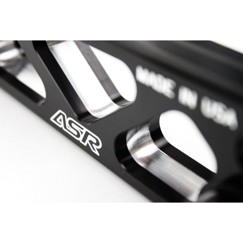 ASR uses U.S.A. made 6061-T6 grade aluminum to manufacture the lower control arm. This material is chosen for its malleable properties. It is similar to the material used on high performance racing wheels for its forgiving impact and stress characteristics. The unique recessed bushing prevents dust intrusion and offers a sleeker look. In addition, the precisely relocated end link mounting holes not only allows for multiple swaybar and end link combinations, but keeps the swaybar arm in optimum geometry.