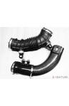 Our new carbon intake tube replaces the stock rubber tube and in doing so smoothens the path from the filter housing to the turbo inlet. The carbon tube incorporates a CNC machined MAF sensor mount so there are no further interfaces after the airflow leaves the filter housing. The tube provides a more gradual change in direction from the filter to the metal turbo inlet tube as compared to the stock rubber tube - this increases the flow efficiency further. Here is a comparison between the stock and carbon tubes.