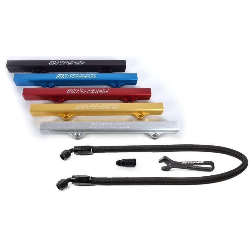 K-Tuned Fuel Line Kits are now available for several of the newer Honda/Acura vehicles that have returnless style fuel systems. The 02-06 DC5 RSX, 02-05 EP3 Civic Si Hatchback, K-Swapped 01-05 EM2 Civics all have returnless fuel setups that use special EFI fittings at all of the fuel related connections. For these chassis, we have developed pre-assembled fuel feed line kits using our lightweight black fuel hose and black anodized fuel fittings. These lines are designed to completely replace the ugly stock rubber fuel line all the way from the firewall to the fuel rail and will help to clean up the look of any engine bay. The first connection is made at the firewall, using a special female EFI fuel adapter that properly adapts the factory hardline to a standard 6AN male fitting. Note that our special adapter fitting uses a threaded aluminum locking clip to ensure that the connection is secure and leak free. We have two different line layouts to choose from; the standard side inlet connects on the left side of the rail, or our center feed inlet which offers a cleaner tucked look by hiding the fuel line partially under the intake manifold before connecting to the center port of our K-Tuned fuel rail. Please note that if you are using a K-Tuned fuel rail with our center mount gauge setup, you can only use the side inlet fuel line. You can purchase any of the lines separately to add to an existing fuel rail or you can go with a complete setup which includes a K-Tuned fuel rail in any of our available color options.
