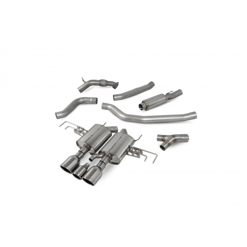 The cat-back system constructed from 3" / 76mm T304 stainless steel pipework. The system can be selected with a resonated or part resonated front section to suit all driving styles. Acoustically constructed rear silencers help eliminate drone as well as provide a sportier exhaust note. The three piece tailpipe set-up consists of 2 larger tailpipes with a smaller tailpipe in the centre that features a distinctive Red Power outlet ring. Daytona and Indy style are available.