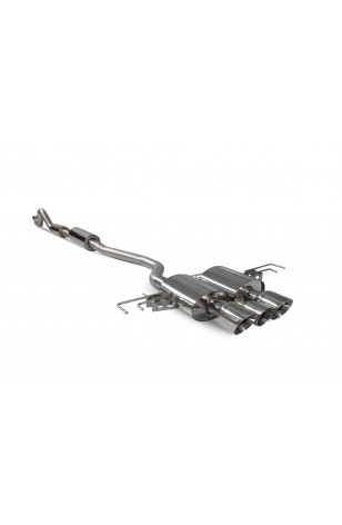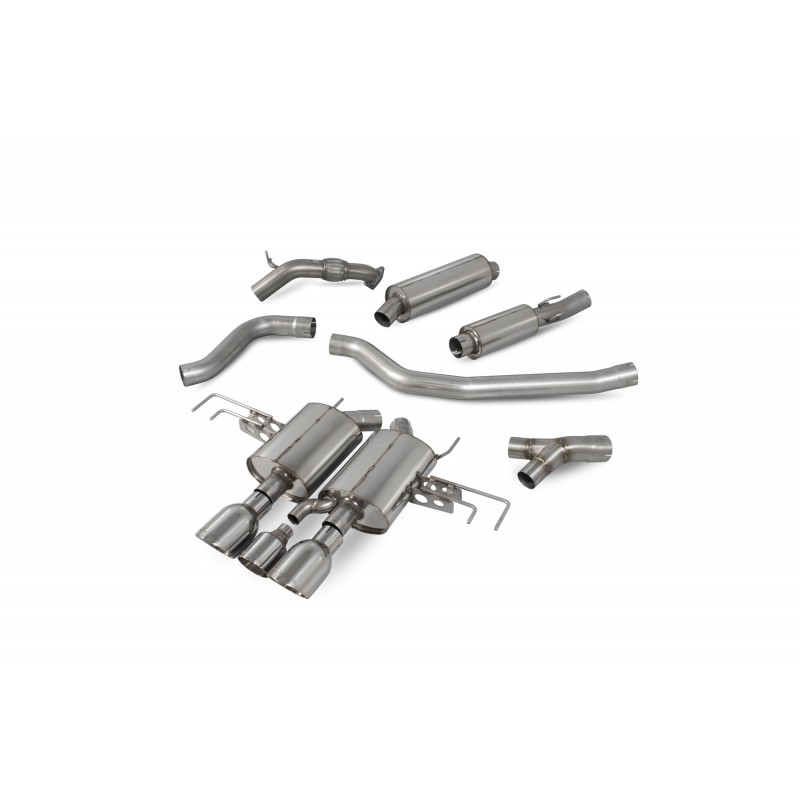 The cat-back system constructed from 3" / 76mm T304 stainless steel pipework. The system can be selected with a resonated or part resonated front section to suit all driving styles. Acoustically constructed rear silencers help eliminate drone as well as provide a sportier exhaust note. The three piece tailpipe set-up consists of 2 larger tailpipes with a smaller tailpipe in the centre that features a distinctive Red Power outlet ring. Daytona and Indy style are available.