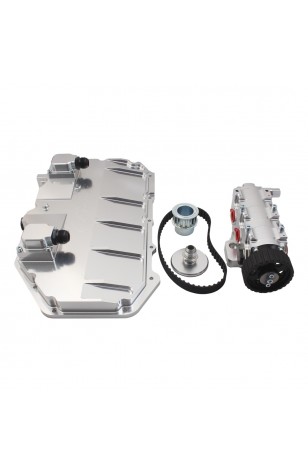 These Kits are available with a choice of Intake or Exhaust engine mounted Oil Pump and supplied with engine oil feed (Oil-In Assembly) adaptor kits, Oil Pump Pulley, pre-machined Crank Shaft Pulley, 3/4" wide 'L'-Section drive belt & a low-profile CNC machined billet aluminium Oil Pan with Turbo drain feature and multi directional scavenge turrets for the easiest routing of oil lines.
