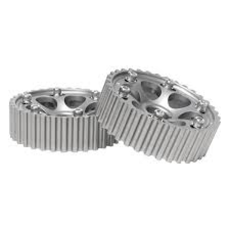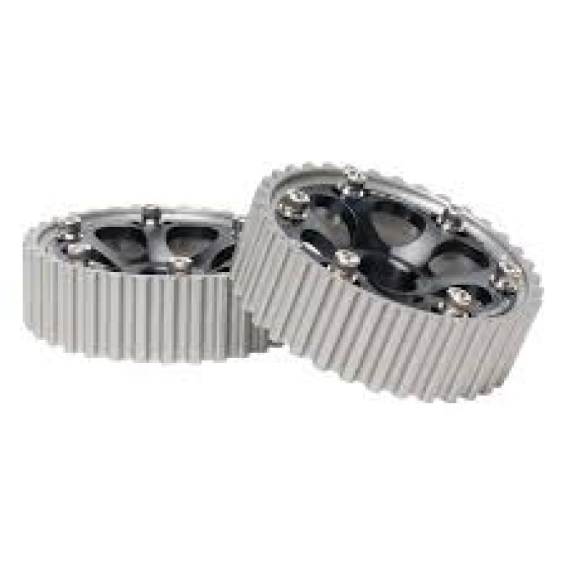 An engine's camshafts must be set at their proper positions relative to the crankshaft in order to maximize horsepower. Pro Series Cam Gears for Honda's B-series and H23A1 engines enable serious tuners to optimize horsepower and torque by being able to adjust camshaft timing +/- 10 degrees, in one-degree increments, allowing them to tailor the power curve appropriately. Thanks to laser-etched timing and directional marks, precise camshaft adjustments can be made quickly and easily. Pro Series Cam Gears feature precision-machined, hard-anodized teeth to reduce premature wear with a signature, six-bolt design that eliminates gear slipping. Skunk2's lightweight design (35 percent lighter than OEM) and CNC-machined, 7075-T6 billet aluminum construction reduces rotational inertia, resulting in increased engine response and acceleration. Skunk2's adjustable cam gears have also been proven on race cars in the most extreme conditions for more than a decade.