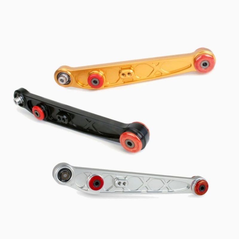 Skunk2 Alpha Rear Lower Control Arms are direct replacements for the factory OEM arms, and are ideal for street and race applications. Benchmarking off of our previous LCA design, our goal was to design an arm that was lighter, stronger, and more durable without increased noise, vibration, or harshness (NVH). The inboard bushing features a large tuned durometer elastomeric bushing, that is hard enough for improved handling performance yet compliant enough to minimize unwanted increase in NVH, while the lower shock mount utilizes Delrin bushings for reduced friction and minimal deflection for improved dynamic shock control.